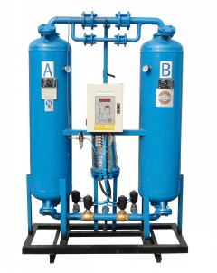 微熱再生壓縮空氣干燥機,綜合變壓吸附和變溫吸附之優點,在常溫高蒸汽分壓下吸附(工作);在較高溫度,低蒸汽分壓下解析(再生),即吸附劑在吸附過程中吸附水份,在再生過程依靠高品質再生氣(加熱干燥的空氣)的熱擴散和低分壓兩種機理的共同作用而得以完全清除。